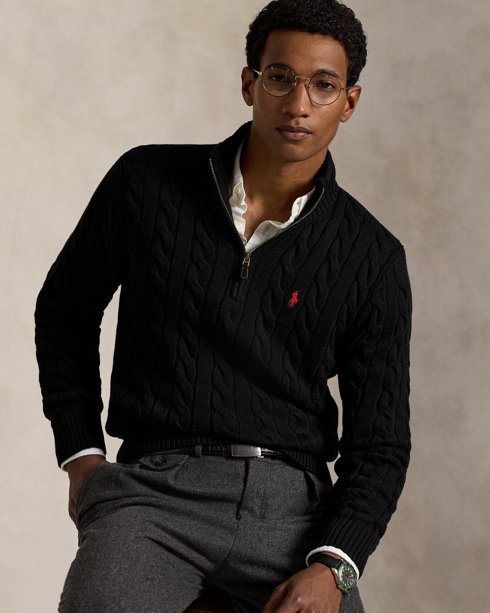 RL-Cable-Knit Cotton Quarter-Zip Jumper-BLACK